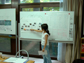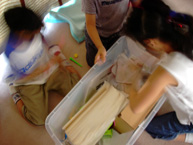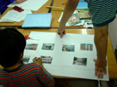 「光をあてるとおもしろそうなもの」という視点でスクールの中をみんなで探索し、いろいろなものを集めてきました。トイレに入ったかとおもうと、消臭ビーズを持って出てきたときにはビックリしました。木やプラスチックなど集めてきたたくさんの素材を、光がすきとおるもの、とおらないもの、はねかえるものの3種類に分類して整理しました。 |