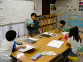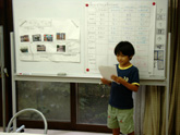 自分の家に遊びに来るお友達に駅から家までの道を説明しよう。という設定で、それぞれの最寄り駅から家までの道やエリアを紹介しました。Mさんはお気に入りのパン屋さんや目印になる病院などを入れて発表しました。T君は道の曲がり角にある建物をうまく使って発表しました。K君はたくさんのエピソードを交えながら住んでいる町を紹介することができました。 |