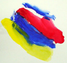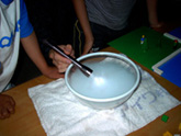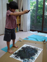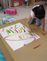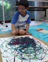 雨水が地面に落ちるとき‥‥、風に葉っぱが揺れるとき‥‥、自然が生み出す偶然の模様をつくり、キャンバスにたたきこむ!アクションペインティングに挑戦しました。自由に色をつくり、腕をブルンとふるって、活き活きとした線をつくりだしていました。筆を振ってしずくを落としたり、絵の具を直接たらしたりと、だれに教わるでもなく発見し、どんどんチャレンジしていく姿に感動させられてしまうナビゲータでした。 |