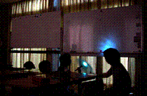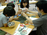 集めた素材に様々なやり方で光を当てて、おもしろい光の模様を探し・考えました。しゃぼん玉に下から当てた光が天井に映っていることに気付いたときには、そのキレイさにみんな大はしゃぎでした。すぐにそれを発表すると決めて発表の練習にとりかかりました。色の付いた洗剤の容器に光を当てて壁にうつる色を楽しんだり、江戸時代の明かり「行灯」をつくって、ぬくもりのある光のよさを感じたりすることができました。 |