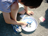 それぞれが家からもってきた虫めがね。大きいの、小さいの、いろいろな大きさがありました。紙の上に虫めがねをかざしてみると、もやもやとした光が映りました。うまく上下させて、焦点(ピント)の合う位置を探します。外で実験すると、紙を燃やすほど強烈な、一つの丸い光が集められました。教室で実験すると、丸い光ではなくて、2本の光の線があわられました。さてここでクエスチョンです。このとき現われた2本の光の線の正体とは、いったい何だったのでしょうか。 |