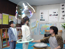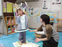 (できた!人の入れるシャボン玉!) |