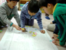 | 情報を集めた後は、調べたことを発表するための準備をしました。1年生グループは消防の仕事にはどんなものがあるか…人を助ける、訓練をする…手分けして作業を進めながら模造紙にまとめていきます。 |