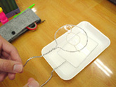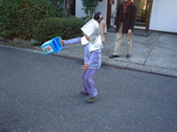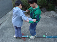 | (こまはなぜ倒れない?) コマがたおれない理由を「回っているとバランスができるから」と、なかなかセンスのあることを言っていたOくんは、水を入れたバケツを回す遠心力の実験に挑戦し、回転するバランスが崩れるとたちまち水がこぼれてくるということをみごとに体感できました。 |