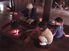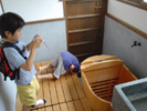 『千と千尋の神隠し』原画・セル画展と、湯屋のモデルとなっている銭湯はじめ、その他のたてものを見学しました。いろりでボランティアのお爺さん方と話しこむ子どもたちの姿は見ているだけで心温まるといった感じでした。木のぬくもり、自然を豊富にとりこんだ庭‥‥昔の家の良さにひたり、満喫している様子でした。 |