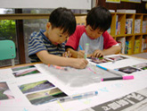スクールの近所の善福寺池から流れる水を追うとどこまで流れているのだろう‥。大きな大きな地図を広げて、善福寺川から神田川、隅田川と続いていく川の流れをクーピーでなぞって追ってみました。 |