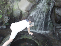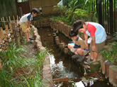 日本の名水百選にランクインした、湧き水を見に行きました。国分寺駅から歩いて15分ほどのところにあるのに、静かでひんやりとして気持ちのいい場所です。水は意外に冷たくて、子ども達の知的好奇心をくすぐります。地元のおじいさんおばあさんからいろいろと教わっている子どもも。水を汲み終えた後は、小さな魚をつかまえようと真剣です。 |