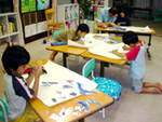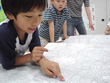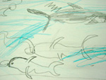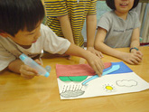 イルカ、クジラ、サメ、タツノオトシゴ、カモメetc。子どもたちの好きな海辺の生物を絵に描いたり、風船にそれぞれの特徴をくっつけてバルーンフィッシュを作ったりしました。なぜかその魚たちは作った子どもたちにソックリ。哺乳類、魚類、甲殻類、鳥類など種の違いや食物連鎖にも挑戦しました。最後に英語で自分が想像する海の様子のプレゼンテーションしました。 |