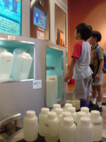 水がどのようにして家庭に届けられるのかを確認することと、本物の給水所を見てその役割を学ぶことを目的に有明にある東京都水の科学館を見学しました。 ビデオの解説のなかで、「水源林」などの言葉がでてくると「あっ水源林知ってる‥」など前回までの授業でやったことを思い出しながら見ることができました。 |