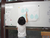 水を守るために家やスクールでできる工夫を、お家の人の意見も聞いて考えました。「歯を磨くときに、水を出したままにしないで、こまめに蛇口を閉める」「油やお醤油をそのまま流さない」といった意見から「いつも飲むお茶をためておいて、お風呂のお湯に使う」というユニークな意見まで様々でました。 |