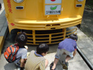 東京都水道局の方々をゲストにお呼びして、泥水の汚れを沈める実験、水の中にどのくらい塩素が入っているか調べる実験など、たくさんの水の実験を行いました。写真は、長い鉄のようなもの?を水道に当てて、中を流れる水の音を聞いているところです。 |