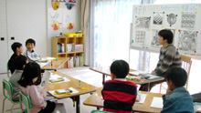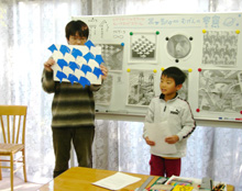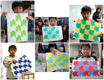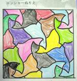 エッシャーのだまし絵を楽しんだ子どもたちは、エッシャー作品のもう一つの特徴であるくりかえしの模様を取り入れた作品を鑑賞し、算数番組のビデオでくりかえしの模様の作り方を学びました。 |