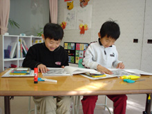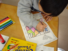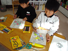 パズルのピースのように隙間なくかみ合う一つの形が、どこまでも繰り返しながら広がっていく様子をビデオでみた子どもたち。「すごーい」「むげんだ‥」と感想をこぼします。そうした原理でつくられたぬりえに挑戦し、ある子はカラフルにある子は規則正しい色の配列を‥と、よく個性がでていました。 |