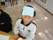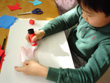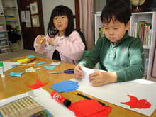 形と色を決めたら、さあお仕事です!あらかじめ型どりをしておいた厚紙を使って、同じ形の切抜きをどんどんつくり、台紙に向きと形をそろえて貼り付けていきます。焦って貼る場所を間違えると、「あれー!形が合わないー!」ということになります。そうです、色紙1枚はパズル1ピースのようなもの。慎重に作業を進めていました。 |