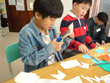 いよいよ作品づくりです。ナビゲータと一緒にくりかえし模様のつくりかたを再確認したあと、まずは色紙を手にとり、自由な形にちょきちょきと切ってみます。底辺を上辺に、右の辺を左の辺に‥‥。何度か切ってみると、できあがった形のなかから、動物や家などの形が連想できてきました。 |